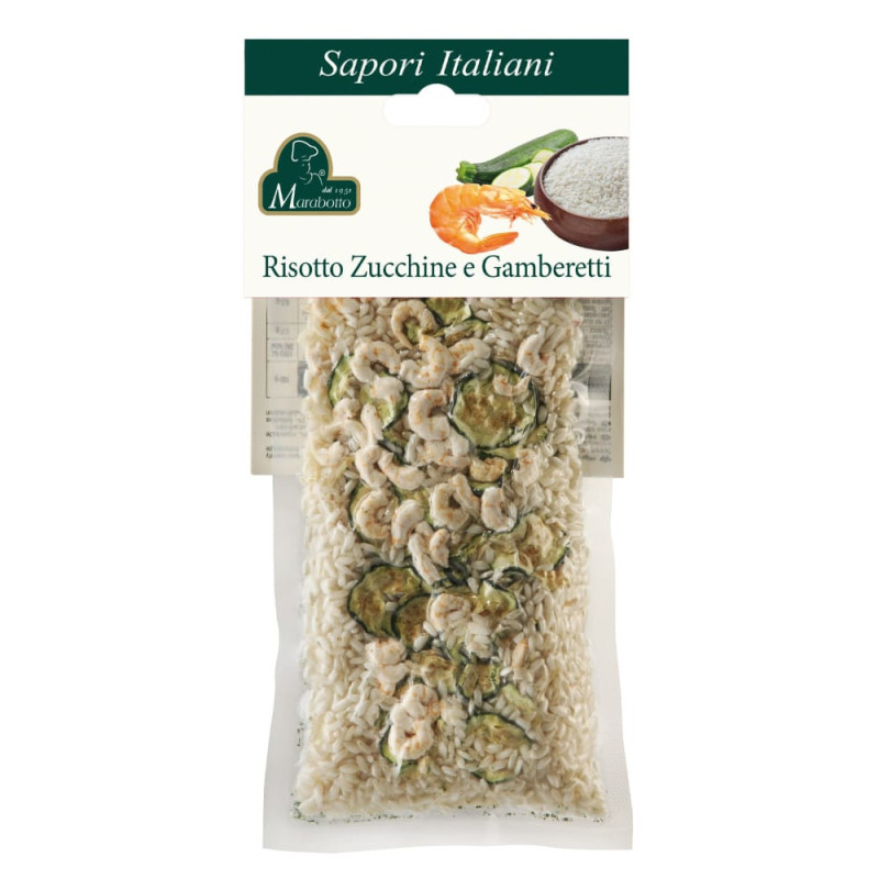 SKŁAD: ryż “Carnaroli” 94,6% (kraj pochodzenia: Włochy), cukinia 2%, krewetki liofilizowane (krewetki, sól) 1%, cebula, pietruszka, por.