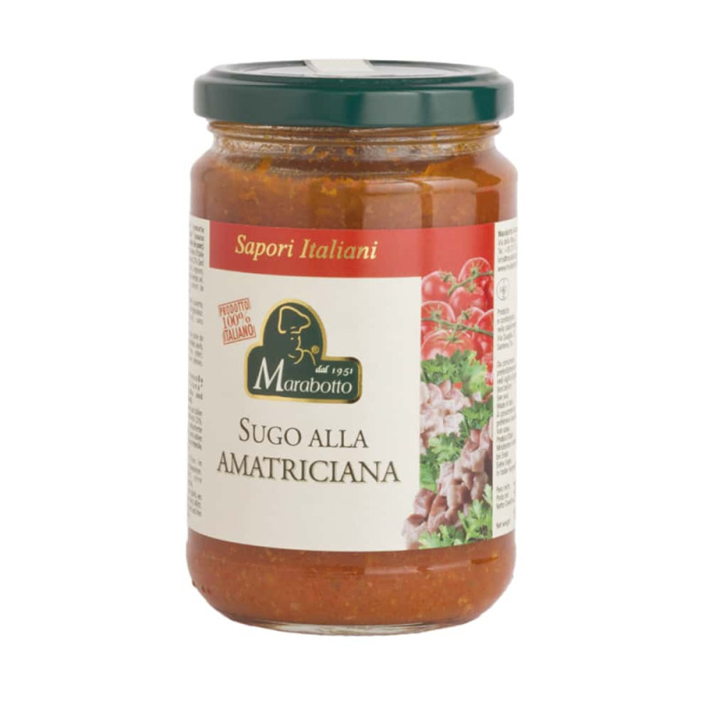 Skład: pomidory 65% (kraj pochodzenia: Włochy), mięso wieprzowe z Włoch [świeży boczek, boczek wędzony (mięso wieprzowe, woda, sól, przyprawy)] 22%, cebula, oliwa extravergine z oliwek, sól, cukier, pietruszka 0,05%, papryczka chilli, regulator: kwasek cytrynowy.